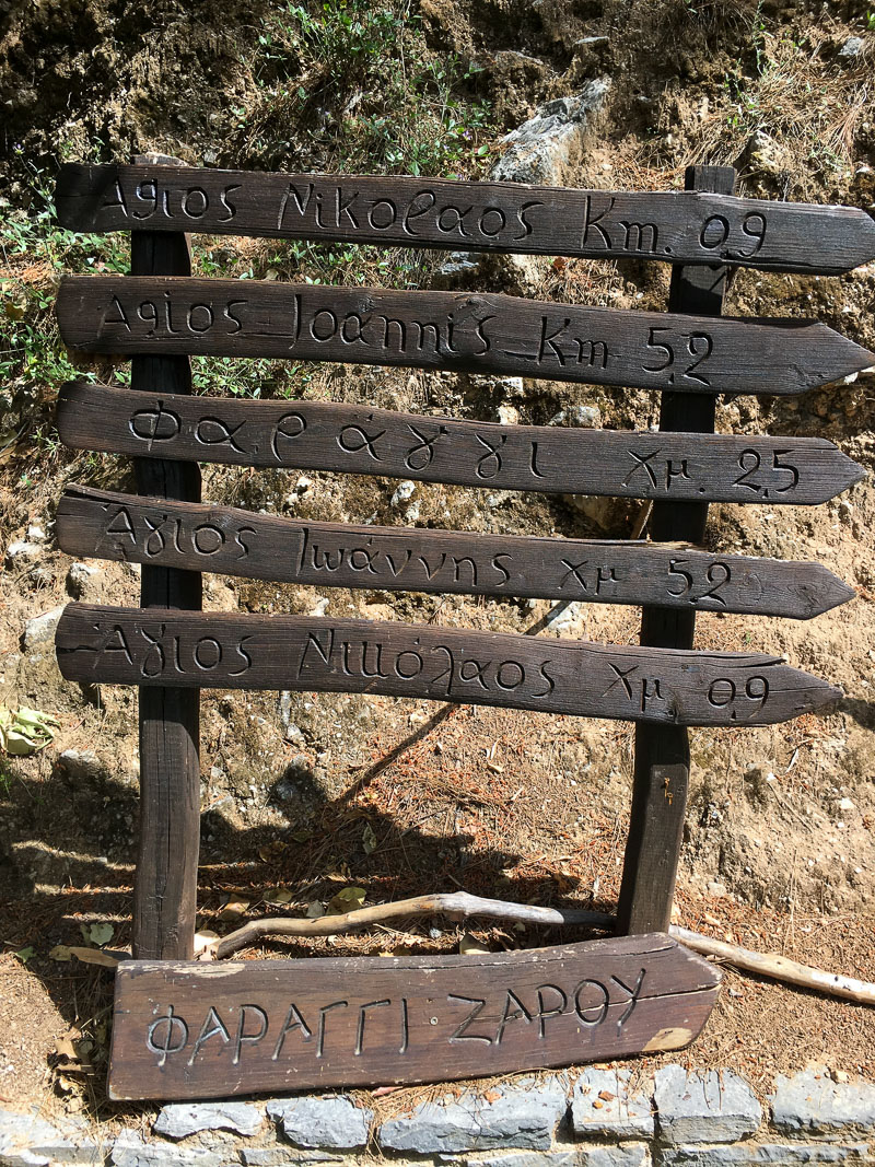 Avant le départ, se renseigner à la Taverna Limni pour les itinéraires et leur niveau de difficulté. Ils sont bien balisés, et les plus courts peuvent se faire en baskets (pour les autres, chaussures de rando bienvenues). Il ne faut pas hésiter à ouvrir les portails en fer tout rouillés en travers du chemin : ils ne sont pas là pour interdire l’accès aux randonneurs mais aux chèvres ! Nous avons choisi au départ celui de 2,5km, très facile avec un point d’eau à mi-parcours et un peu d’ombre. Après la pause pique-nique, la moitié de l’effectif a voulu enchaîner avec un autre sentier.