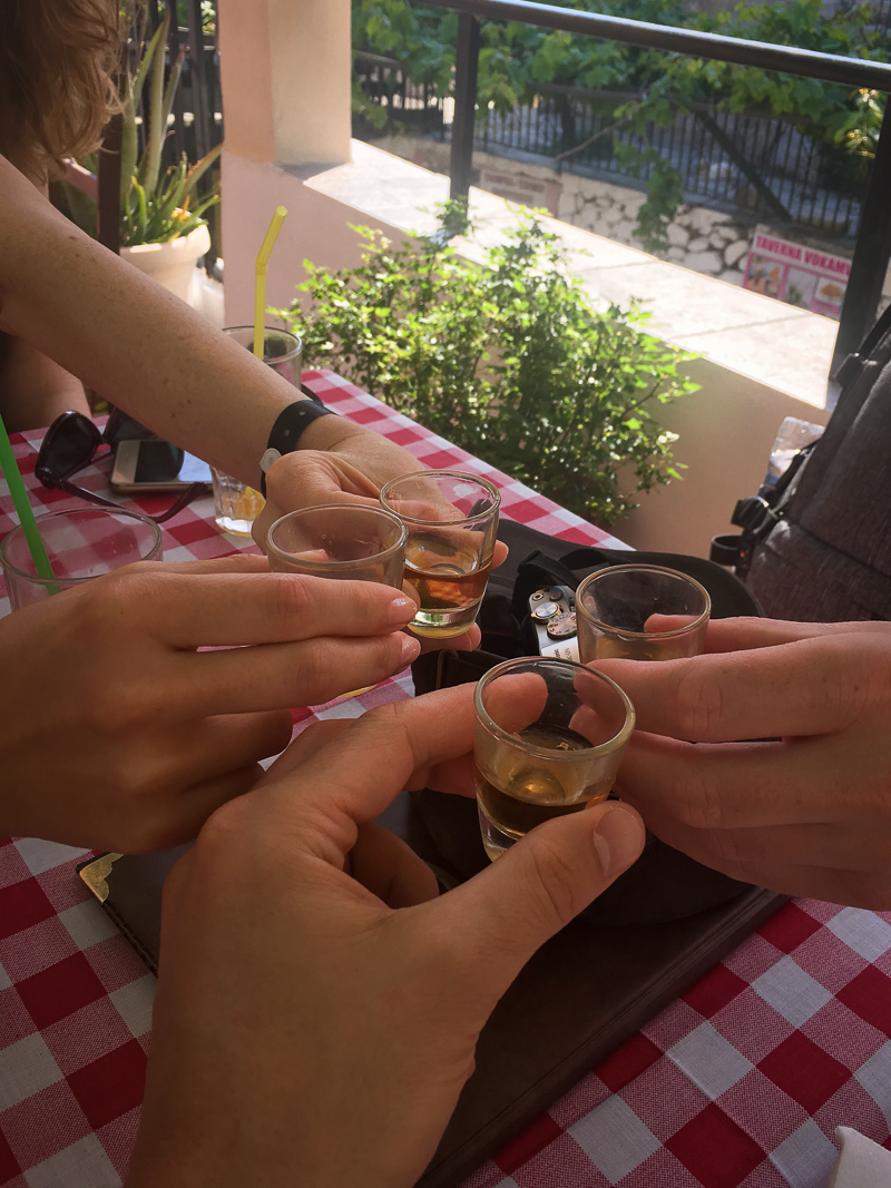 Et impossible de dire non au patron qui offre volontiers sa tournée de rakomelo artisanal (oui, même à 16h en plein cagnard. T’es un aventurier, ou bien ?)