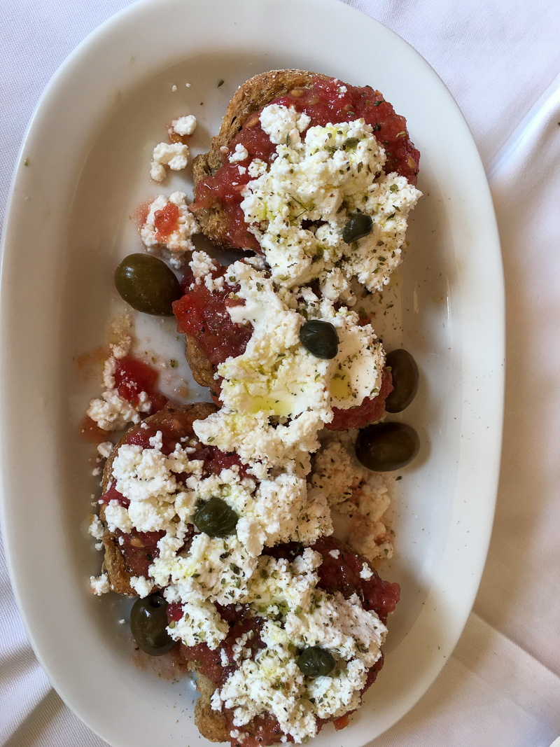 Ambiance quand nous sommes arrivés : le vieux patron (polyglotte) se chamaillait avec la serveuse en faisant un Tetris high level avec les tables pour caser tout le monde. Première découverte des dakos : du pan con tomate upgradé avec de la feta. Repas très correct et prix idem (même si le patron s’embrouillait graaaave dans les comptes de toutes les tables) : 49 euros pour 4 avec les dakos à partager, 4 plats, 2 bières, un verre de vin et une bouteille d’eau.
